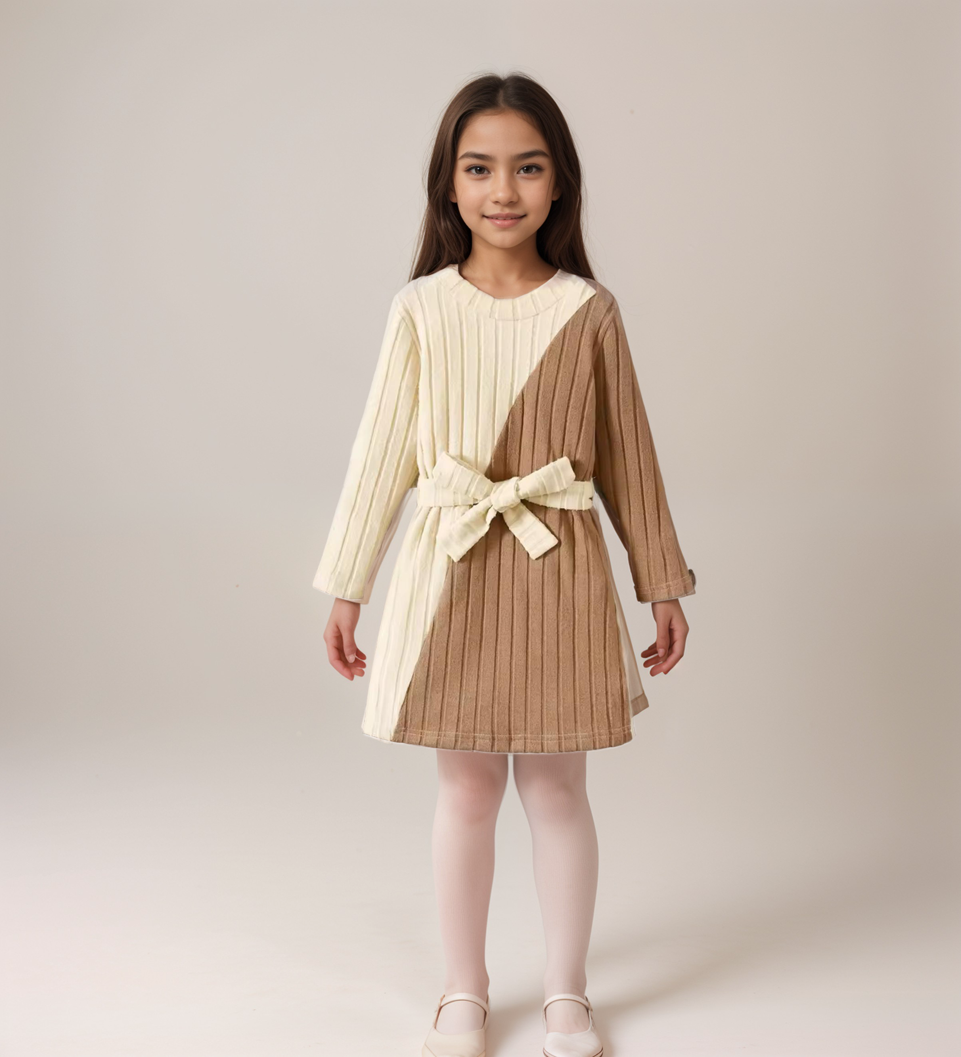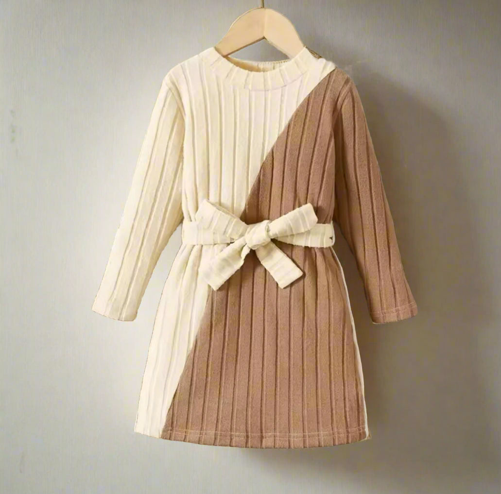 فستان محبوك أنيق بتصميم مضلع ثنائي اللون، وأكمام طويلة، وحزام فيونكة ساحر، مثالي لإطلالة مريحة وأنيقة.