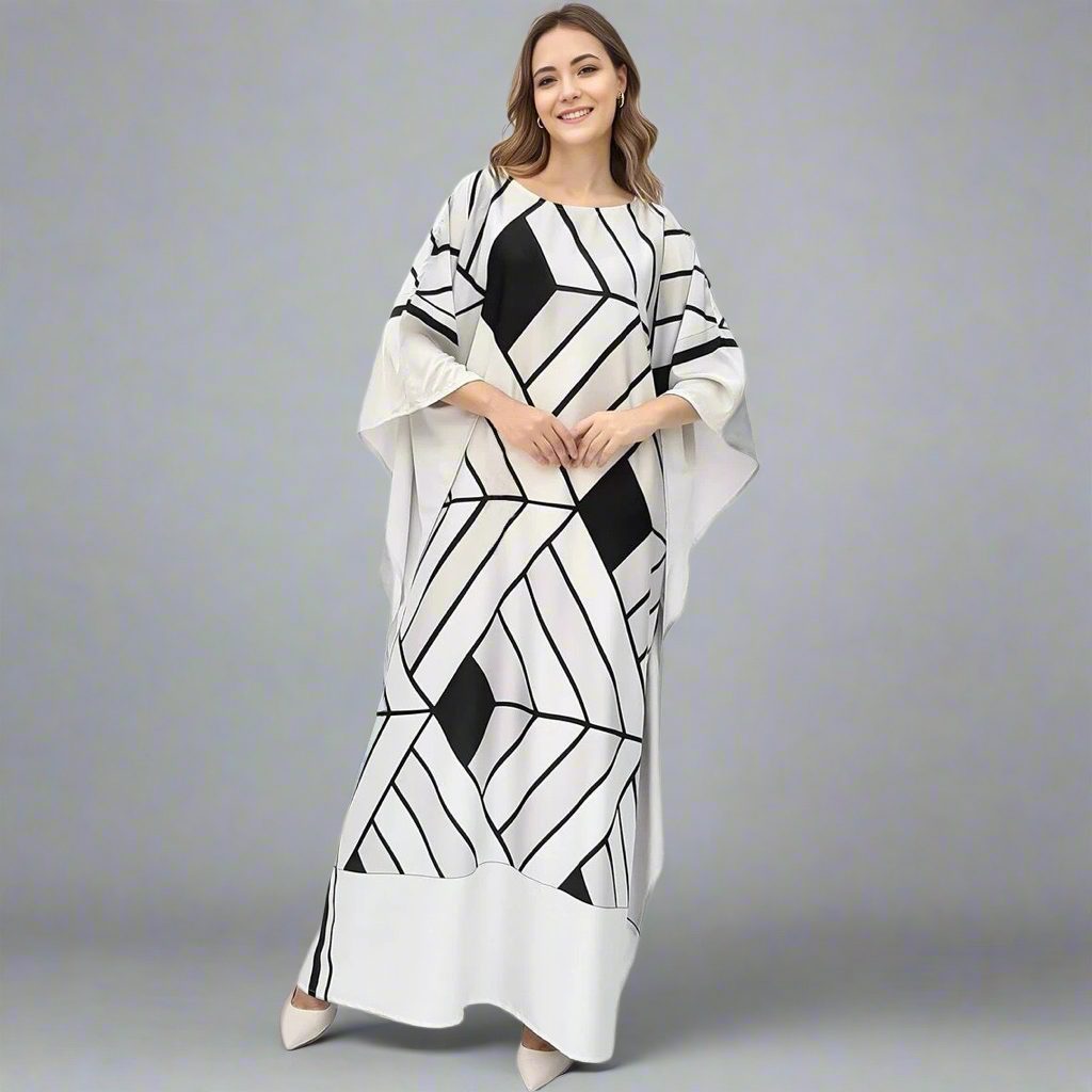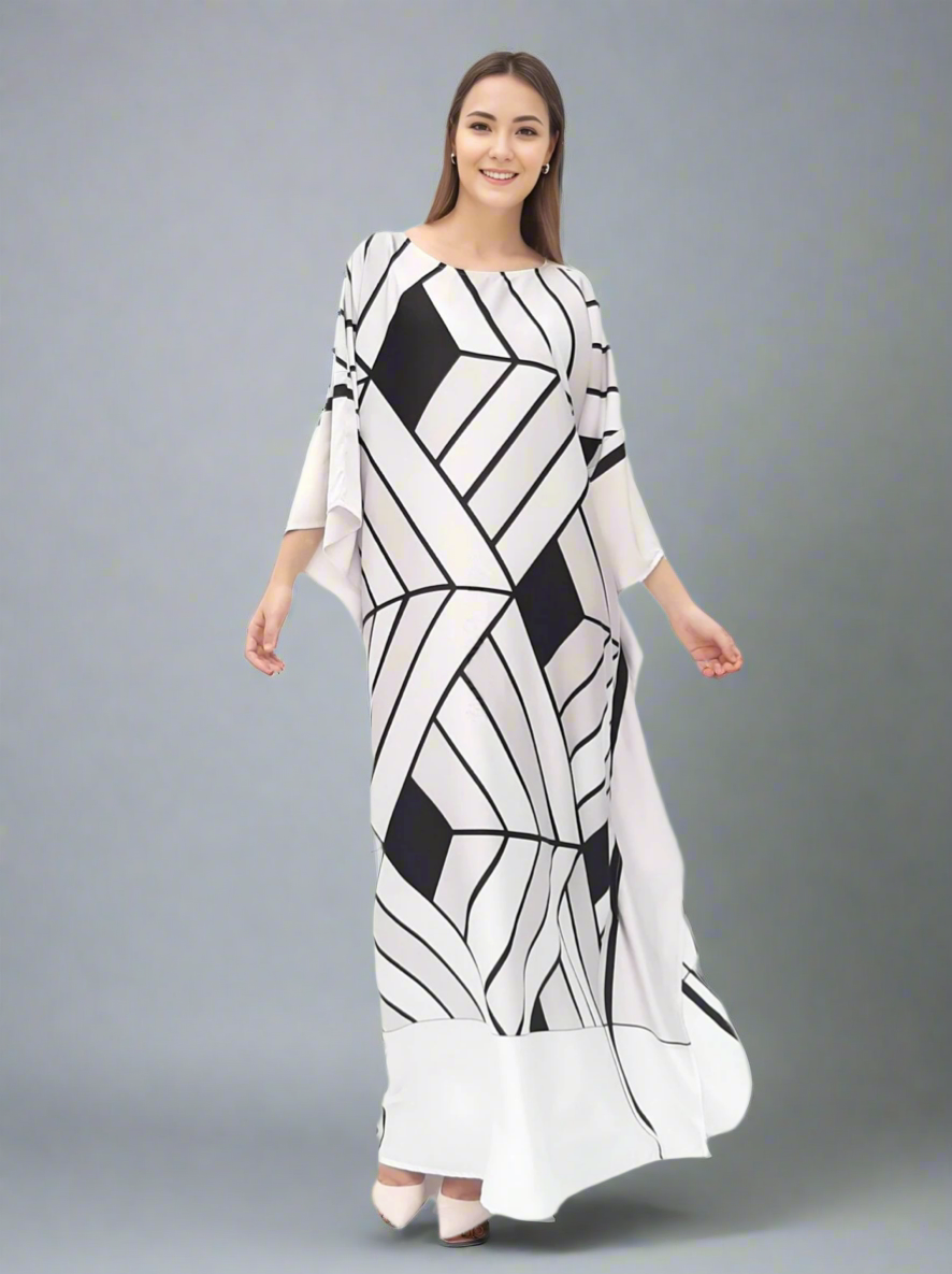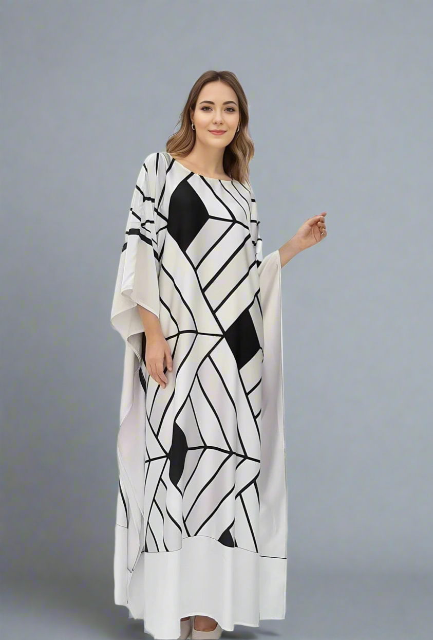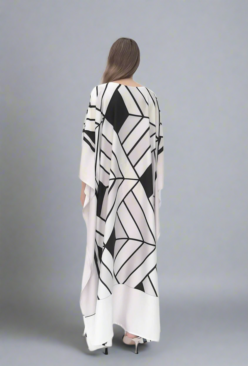 Step into effortless elegance with this flowing satin silk kaftan, designed with a modern geometric pattern that blends sophistication and comfort. The smooth satin silk fabric drapes beautifully, creating a flattering silhouette perfect for casual outings, evening gatherings, or special events. Lightweight yet luxurious, this kaftan ensures comfort and timeless style across all seasons.