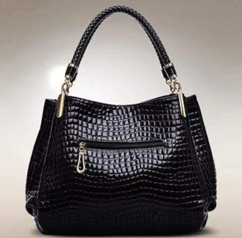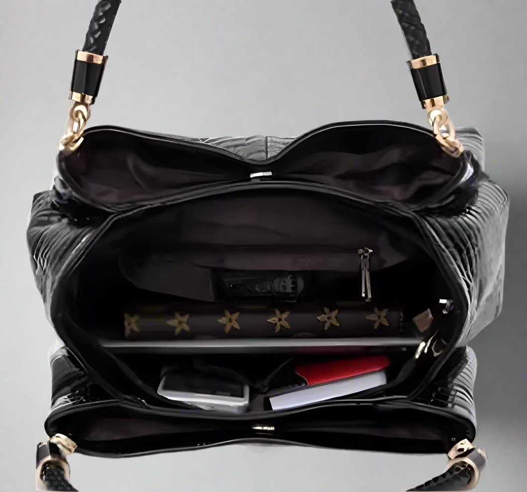 "Luxurious black crocodile-textured handbag with braided handles and gold accents – a timeless statement of elegance and style."