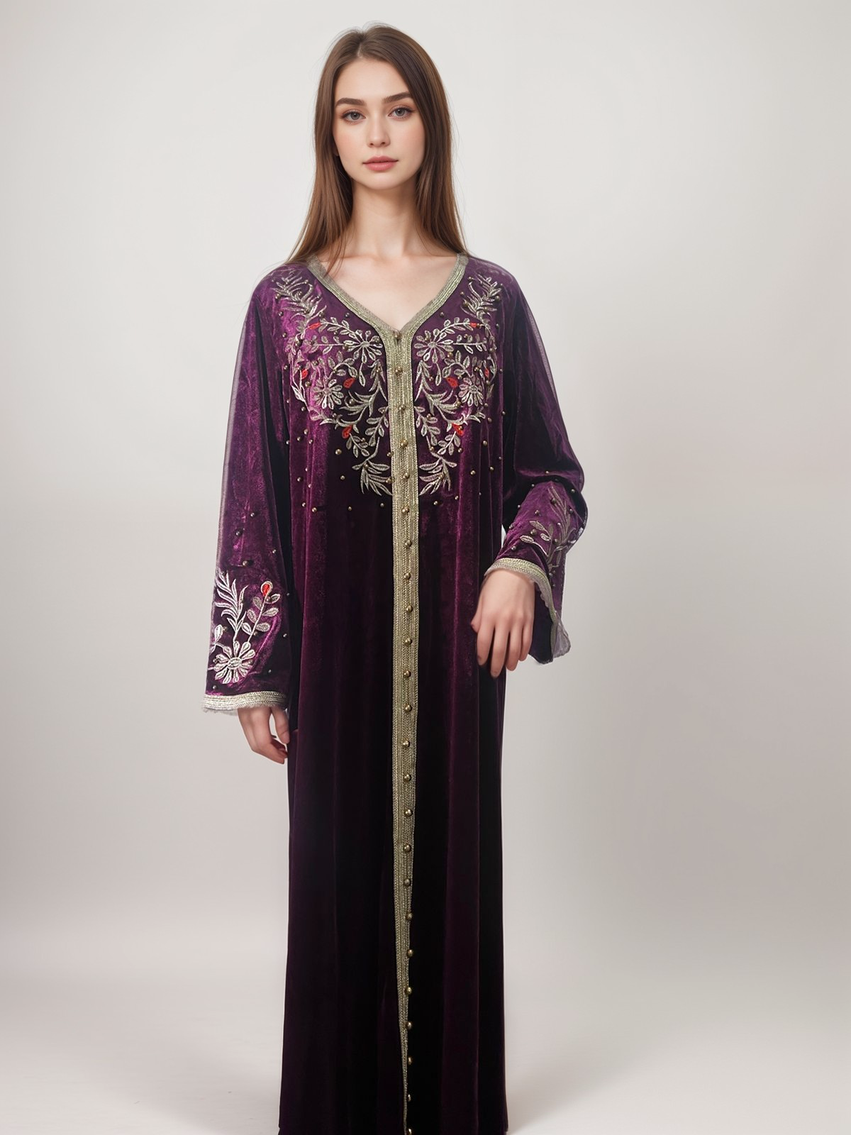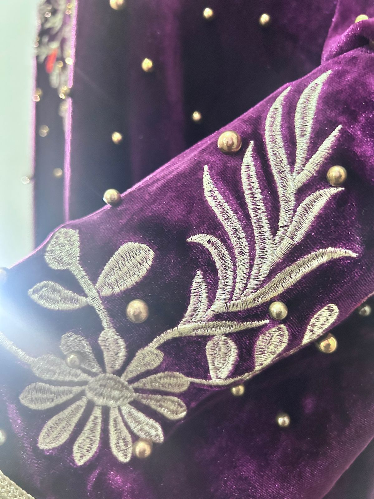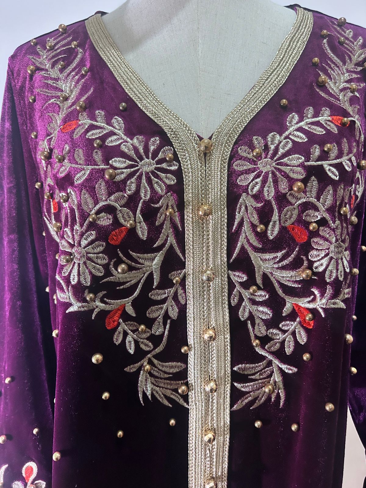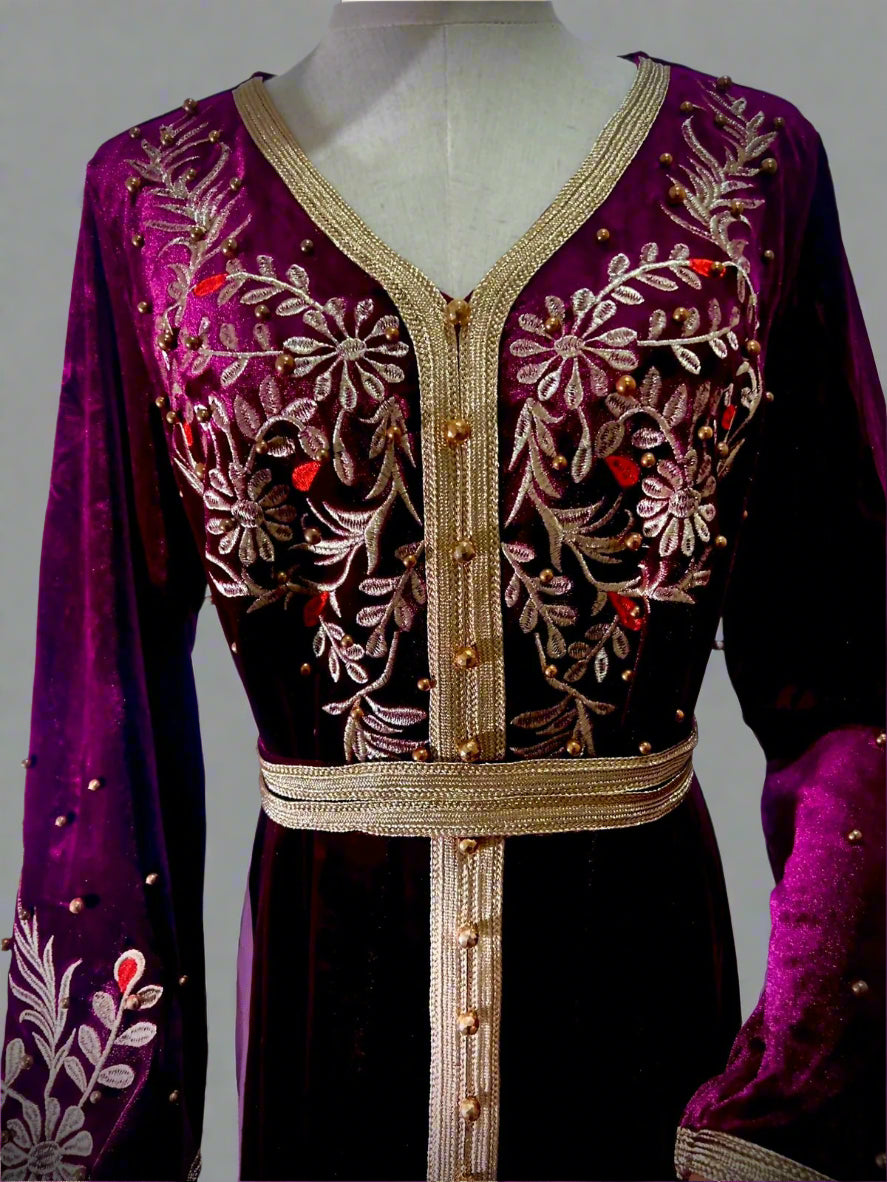 A luxurious purple velvet caftan with gold embroidery, beadwork, and elegant floral accents, exuding regal charm.