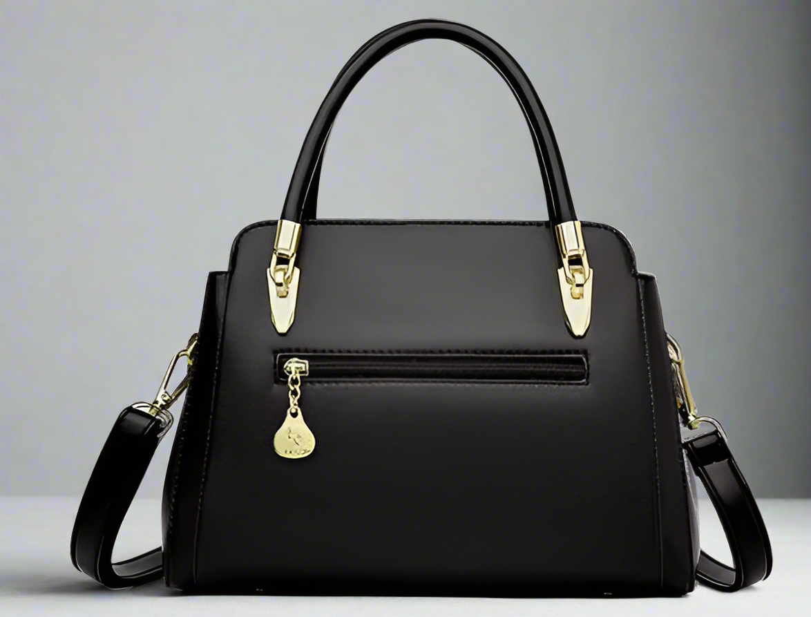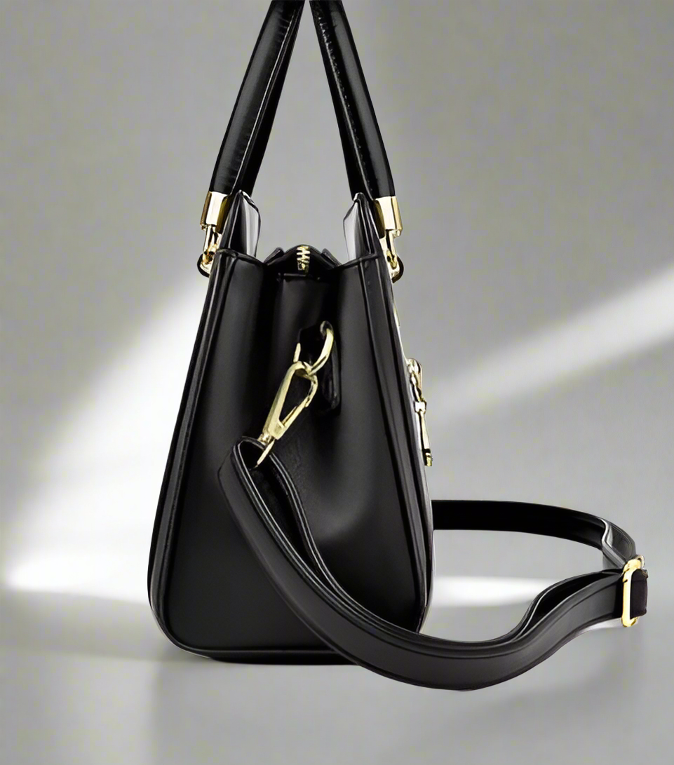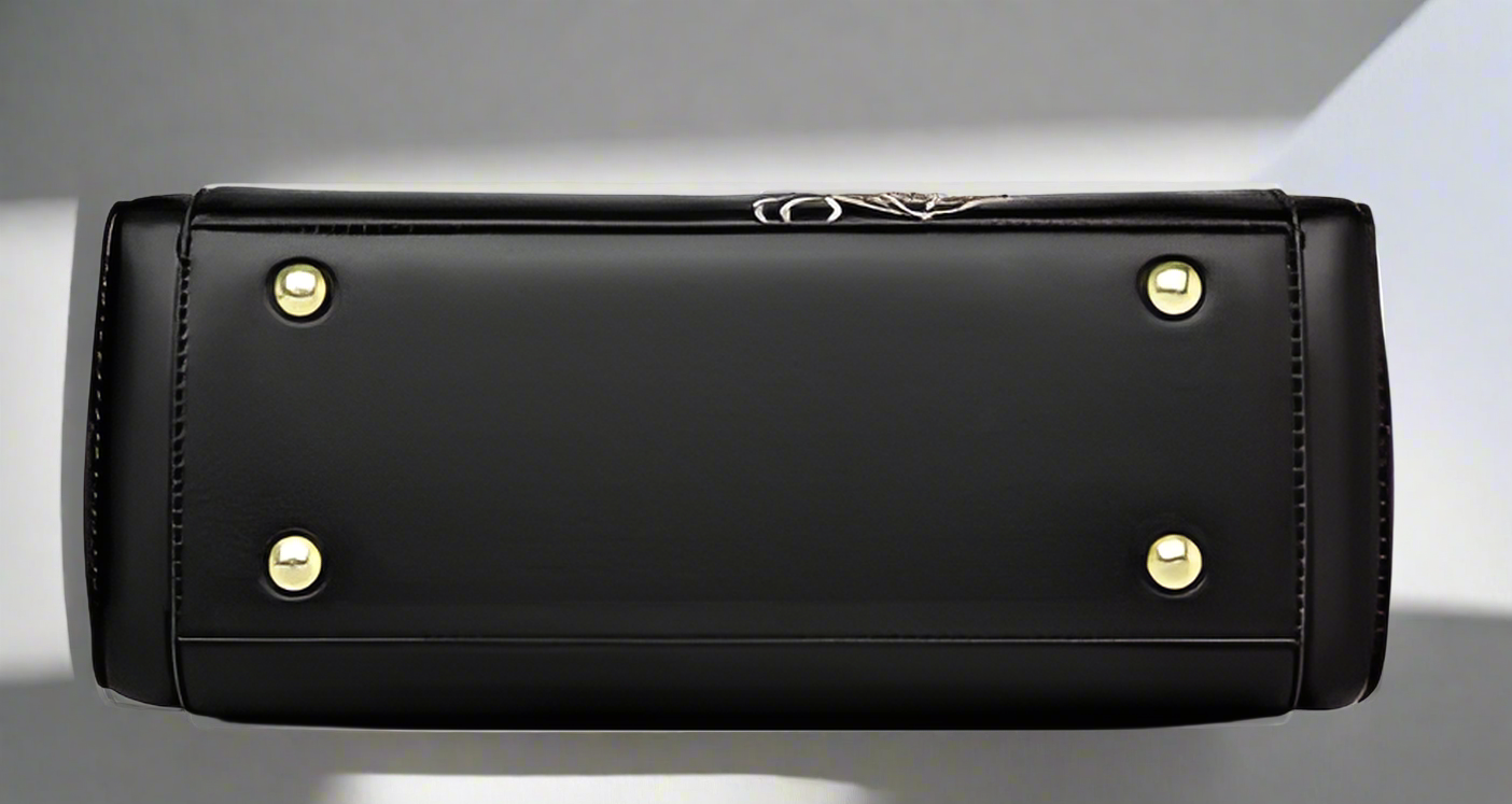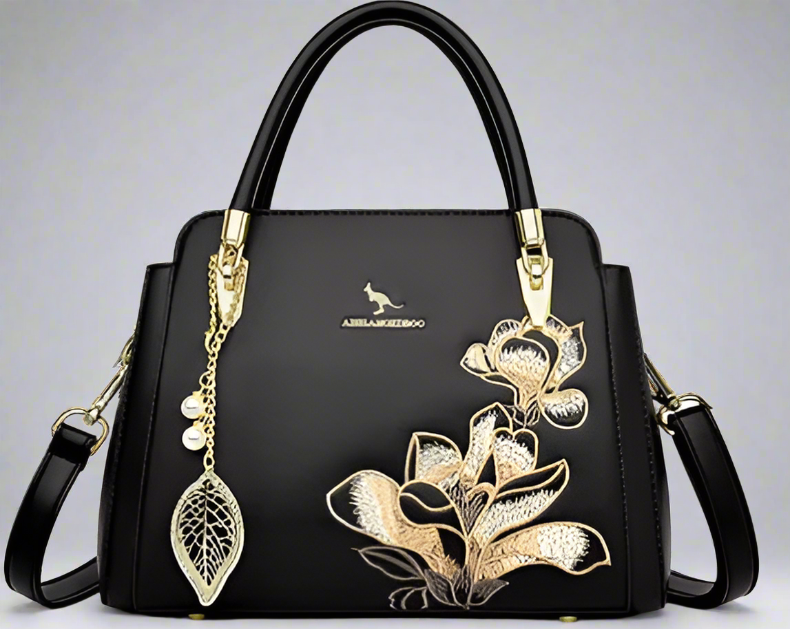 Elegance in every detail – this stunning black handbag adorned with golden floral accents is your perfect statement piece for any occasion.