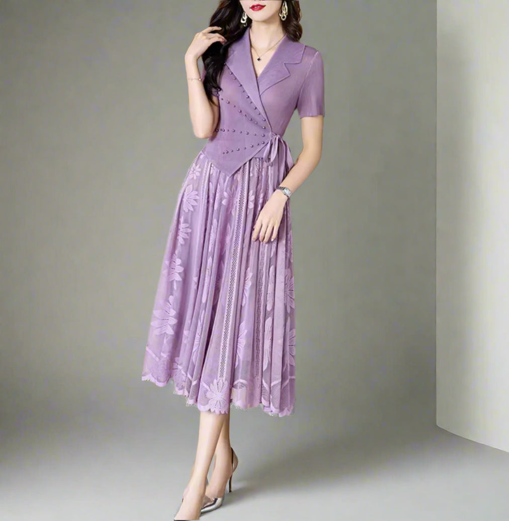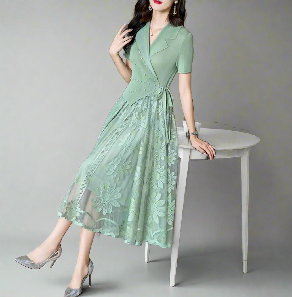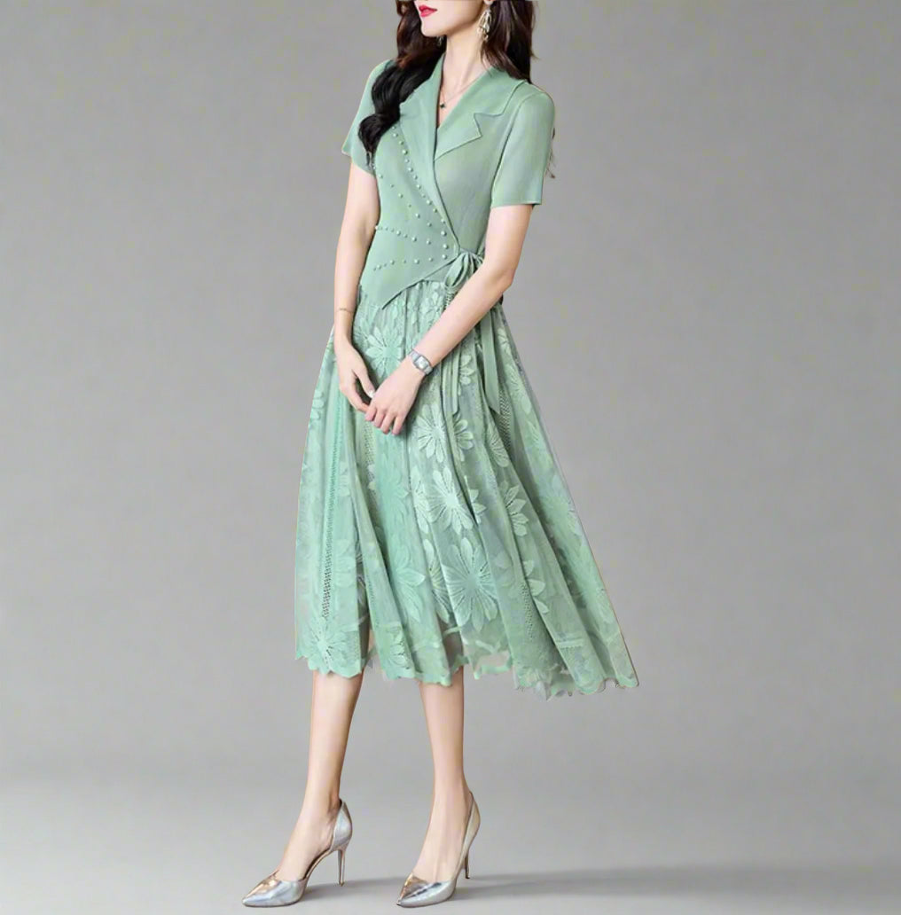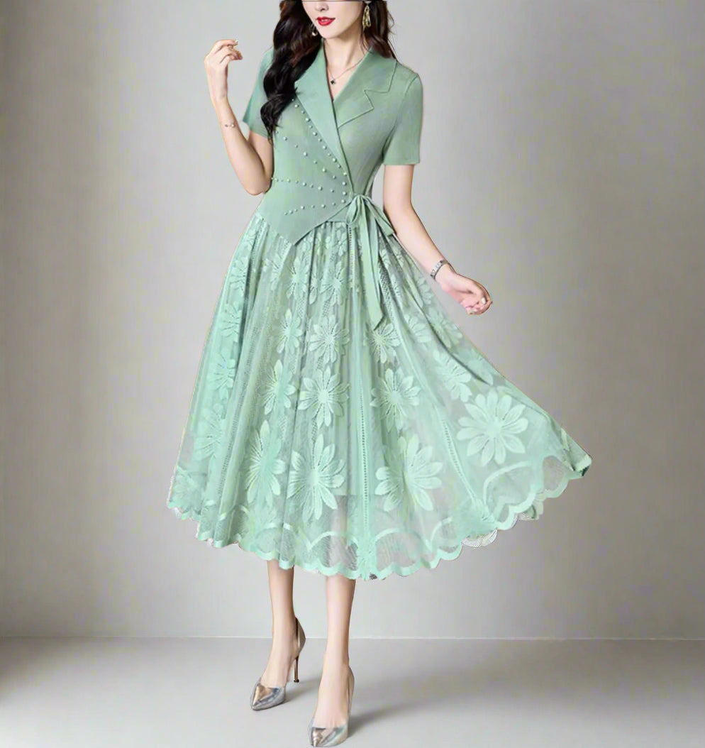 Elevate your wardrobe with this Elegant Lace Embroidered Midi Dress – a perfect fusion of sophistication and charm. Designed with a tailored blazer-style bodice and a gracefully flowing floral lace skirt, this dress offers a refined silhouette that flatters all body types. The side-tie waist enhances your shape, while delicate bead detailing adds a touch of luxe. Ideal for formal events, garden parties, or daytime weddings, this versatile piece transitions seamlessly from day to evening.