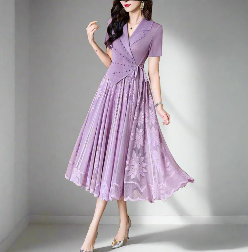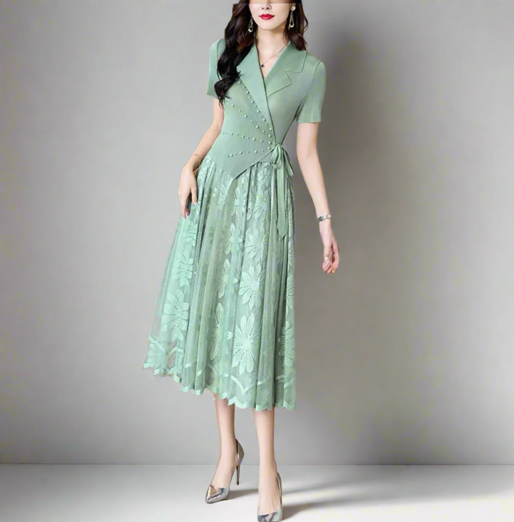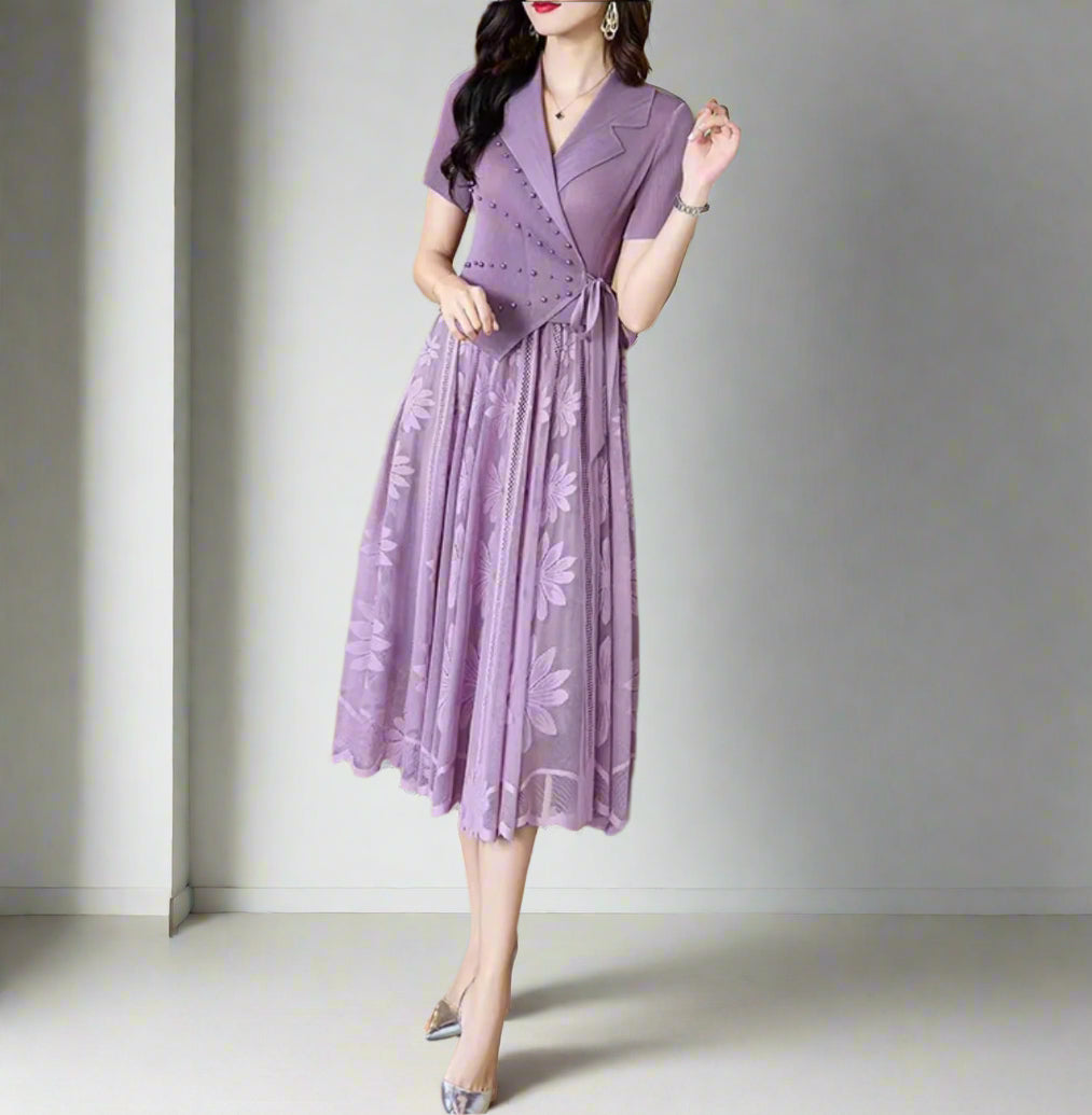 Elevate your wardrobe with this Elegant Lace Embroidered Midi Dress – a perfect fusion of sophistication and charm. Designed with a tailored blazer-style bodice and a gracefully flowing floral lace skirt, this dress offers a refined silhouette that flatters all body types. The side-tie waist enhances your shape, while delicate bead detailing adds a touch of luxe. Ideal for formal events, garden parties, or daytime weddings, this versatile piece transitions seamlessly from day to evening.