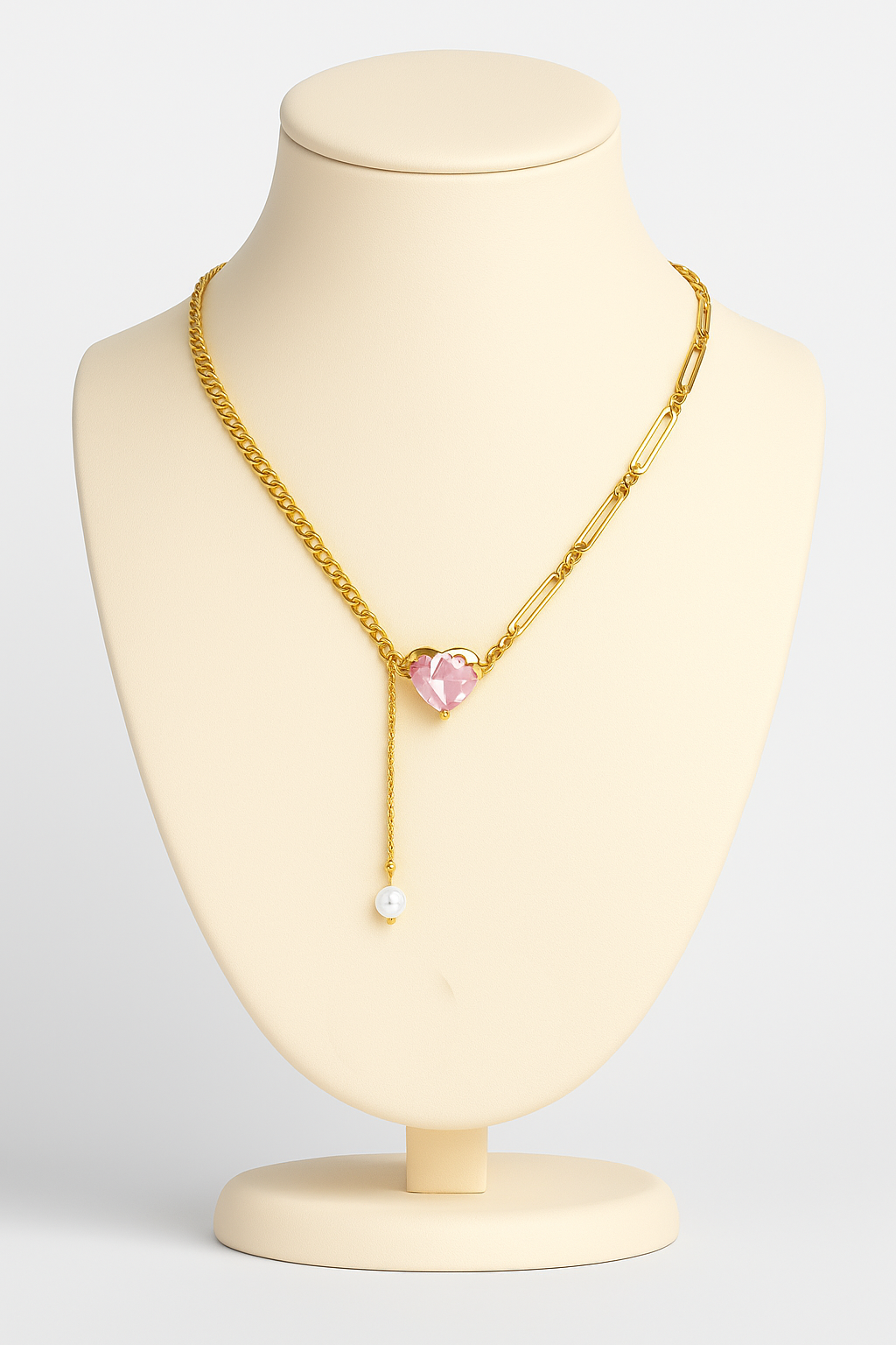 Add a dash of romance and sparkle to your style with the Sweetheart Drip Pendant Necklace. Featuring a heart-shaped pink cubic zirconia stone that glistens like candy, drizzled in gold plating, and finished with a delicate imitation pearl drop. This asymmetrical gold chain design is a blend of sweet charm and edgy luxury, perfect for modern romantics.